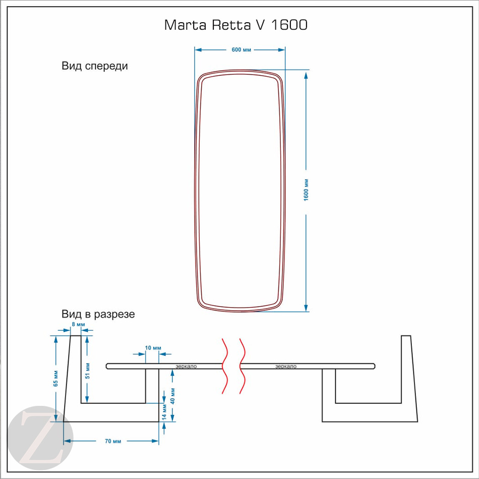 Зеркало прямоугольное Marta Retta V 1600*600mm